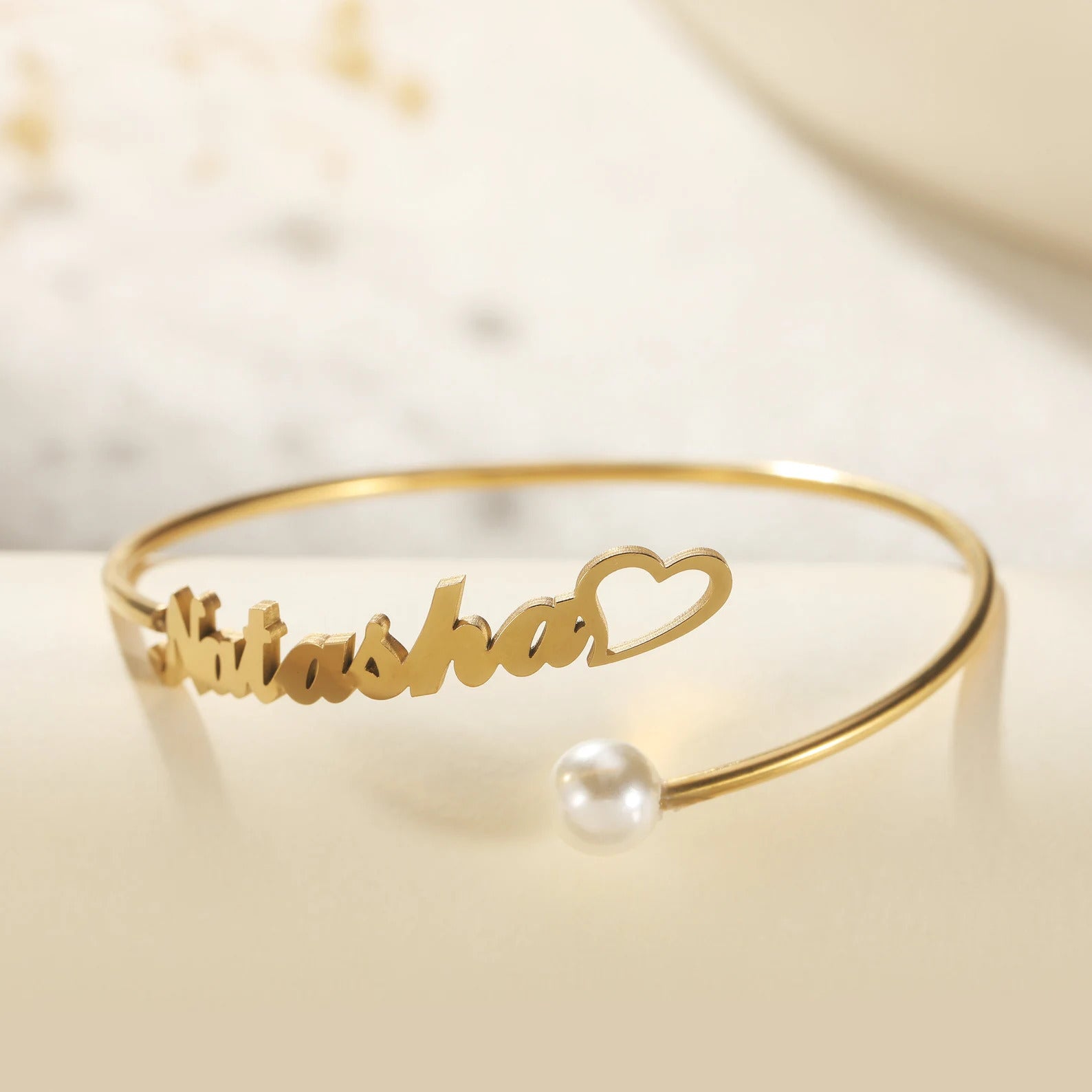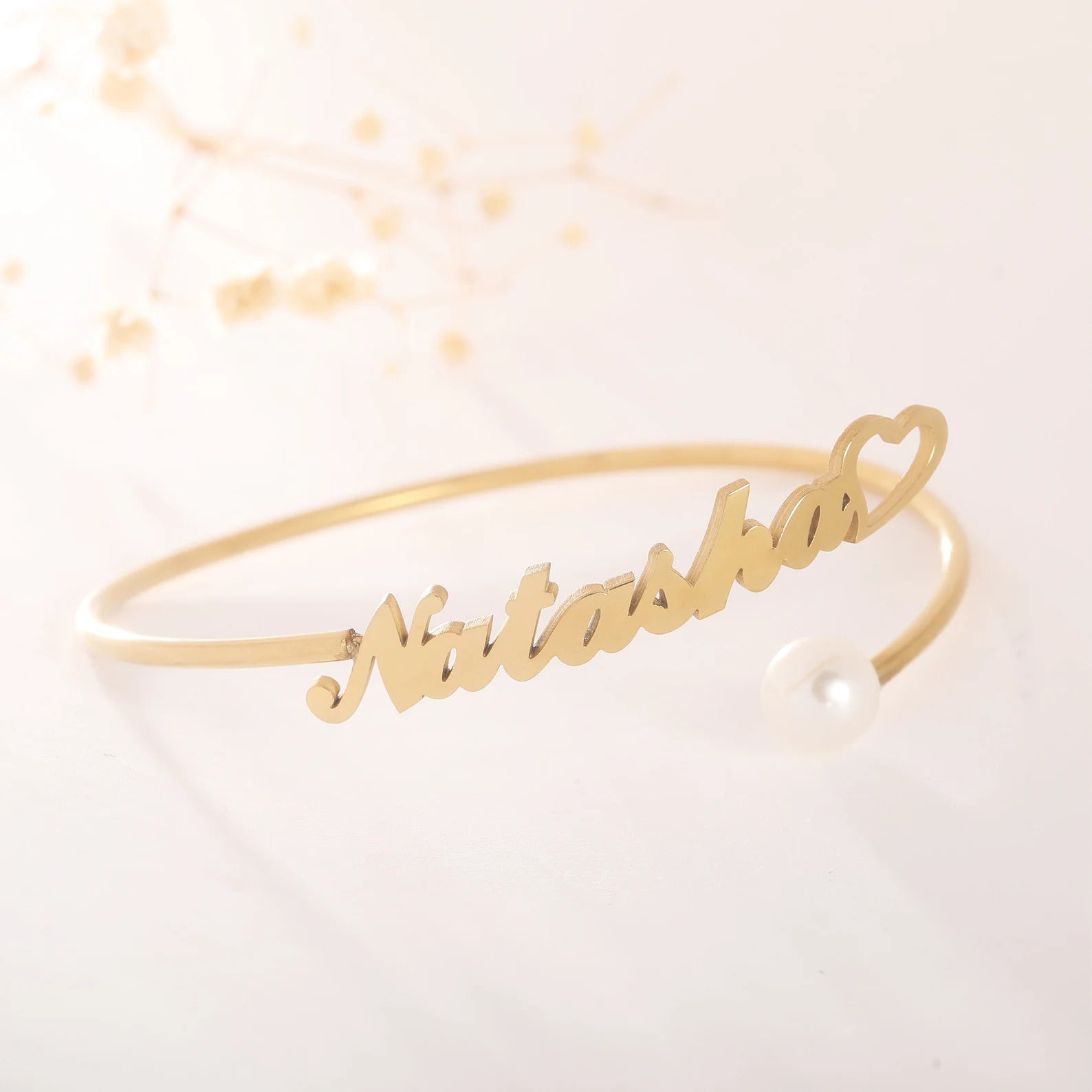 • A timeless personalized name bracelet, crafted in gold plating with a delicate heart detail and pearl accent.