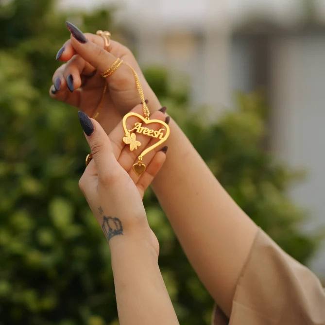 Celebrate love, friendship, or self-expression with our Personalized Heart Name Necklace. Crafted in a stunning gold-tone finish, this elegant pendant features your chosen name delicately framed in a heart, accented with a charming butterfly and a dangling heart charm.